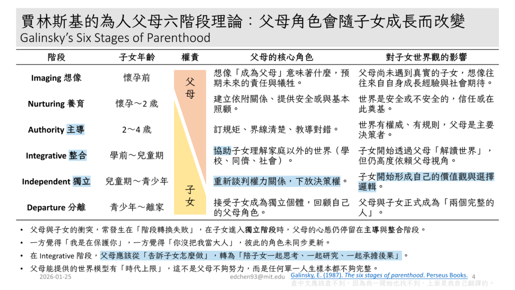 賈林斯基的為人父母六階段理論 (Galinsky’s Six Stages of Parenthood),正是少數聚焦於「父母如何隨子女成長而改變角色」的發展心理學架構。這篇文章不是要父母立刻調整教養策略,也不是要子女用理論說服父母,而是提供一張座標圖,幫助雙方理解:自己目前站在哪一個位置,正在經歷什麼樣的角色轉換,以及彼此為何會在某些時刻產生摩擦。 理解階段,不等於立刻放手;但沒有階段概念,放手往往只能停留在模糊而充滿焦慮的口號。