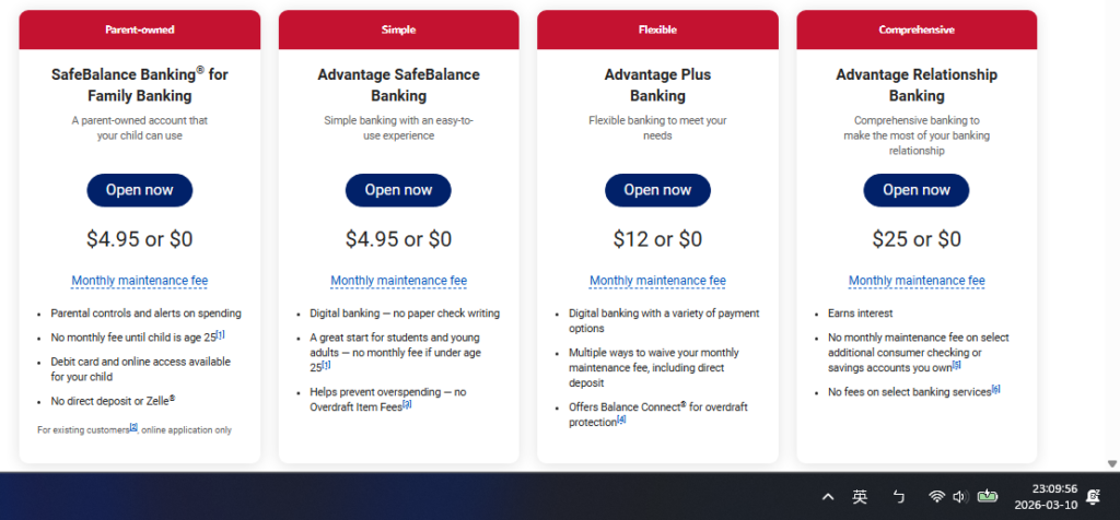 Chase 的帳戶類型和 BOA 類似,但優勢在於分行和 ATM 網絡非常密集,尤其在東岸與大城市。Chase 也提供一些針對學生的優惠帳戶,例如 Chase College Checking,通常在一定年齡或學生身分下可以免除月費。